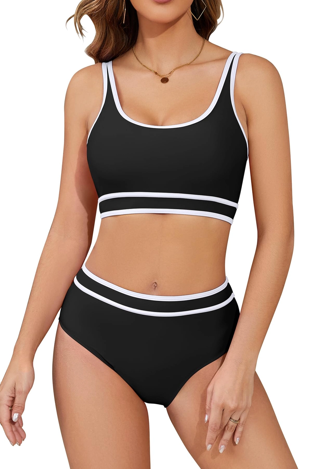 Sportinio stiliaus dviejų dalių moteriškas bikinis su aukštu liemeniu ir kontrastingais baltais akcentais. Puikiai tinka aktyvioms moterims, mėgstančioms komfortą ir judėjimo laisvę.