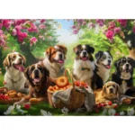 Spalvingoje iliustracijoje vaizduojama draugiška šunų kompanija, apsupta žydinčių gėlių, pikniko krepšių ir saulėtos gamtos. Dėlionė spausdinta naudojant didelės raiškos spalvas, tad kiekviena detalė atgyja!