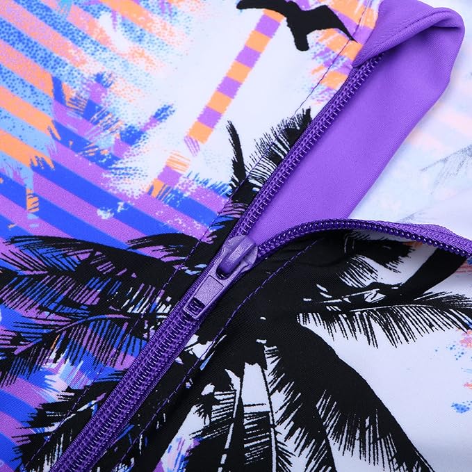 Stilingas tropinis dizainas su palmių siluetais ant baltai-violetinio fono primena saulėlydį egzotiškame paplūdimyje, o ryškiai violetinės rankovės suteikia žaismingumo ir išskirtinumo. Praktiškas priekinis užtrauktukas leidžia lengvai aprengti ir nurengti vaiką, o tamprus, greitai džiūstantis audinys nevaržo judesių ir garantuoja komfortą visos dienos metu.