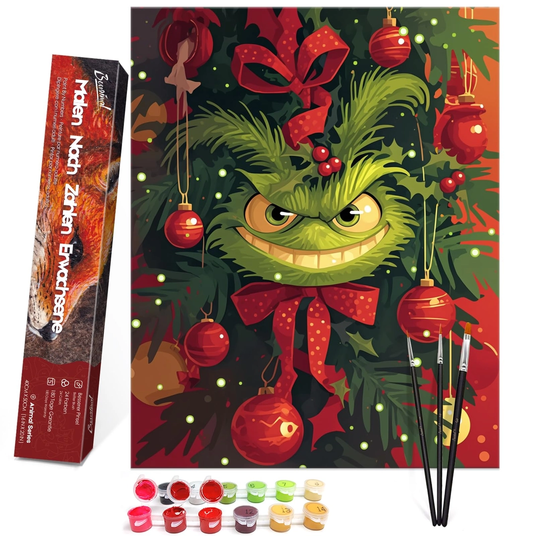 Tapyba pagal skaičius su Kalėdine Grinčo nuotaika – rinkinys su dažais, teptukais ir 40×50 cm drobe. Linksmas dekoras ar unikali dovana!