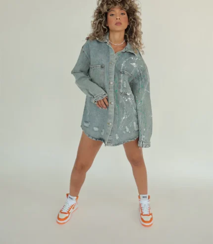 Oversize džinsinė striukė-suknelė su „Tom & Jerry“ piešiniu nugaroje. Dydis M (per krūtinę 54 cm), laisvas modelis, meniškos detalės.
