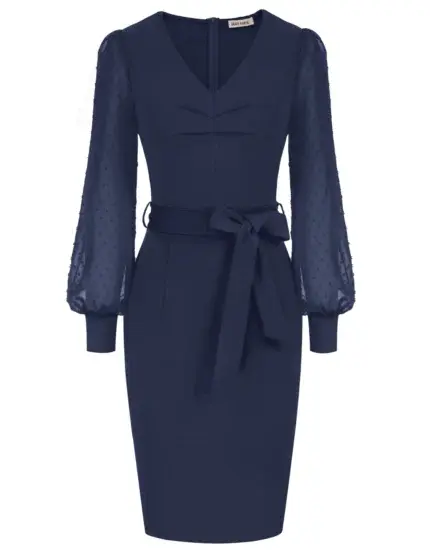 Ši elegantiška tamsiai mėlyna suknelė – tai rafinuoto stiliaus ir subtilaus moteriškumo derinys, puikiai tinkantis tiek verslo aplinkai, tiek ypatingoms